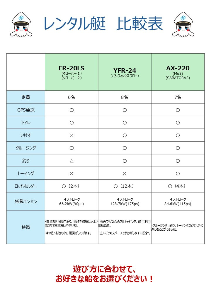 AX220、FR-20LS、YFR-24の艇がレンタルできます。