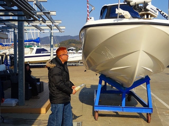 安全航行を祈願しまして、シャンパンによるお清めです。