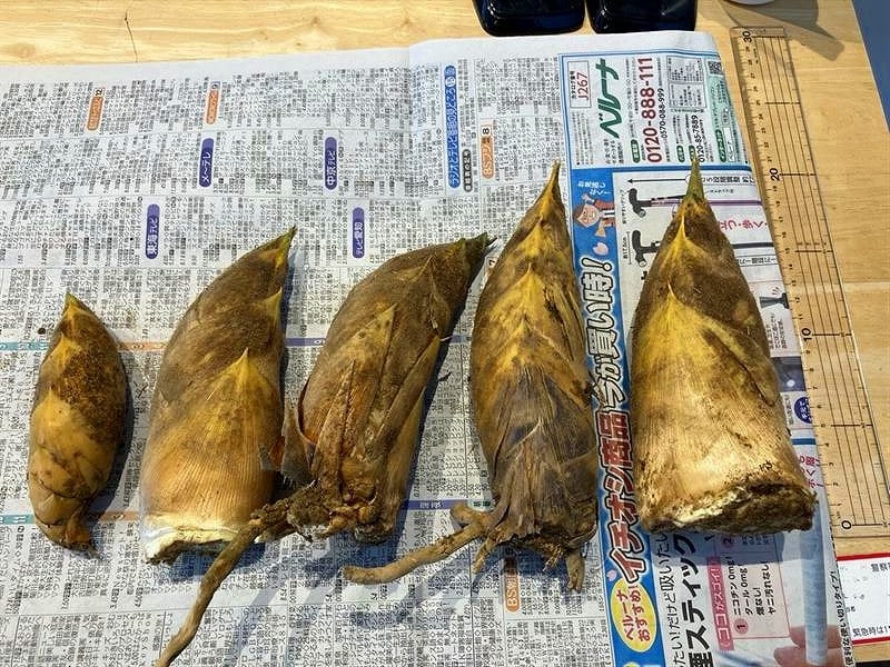 一番右側の太くて立派なタケノコは、長さ22cm程。