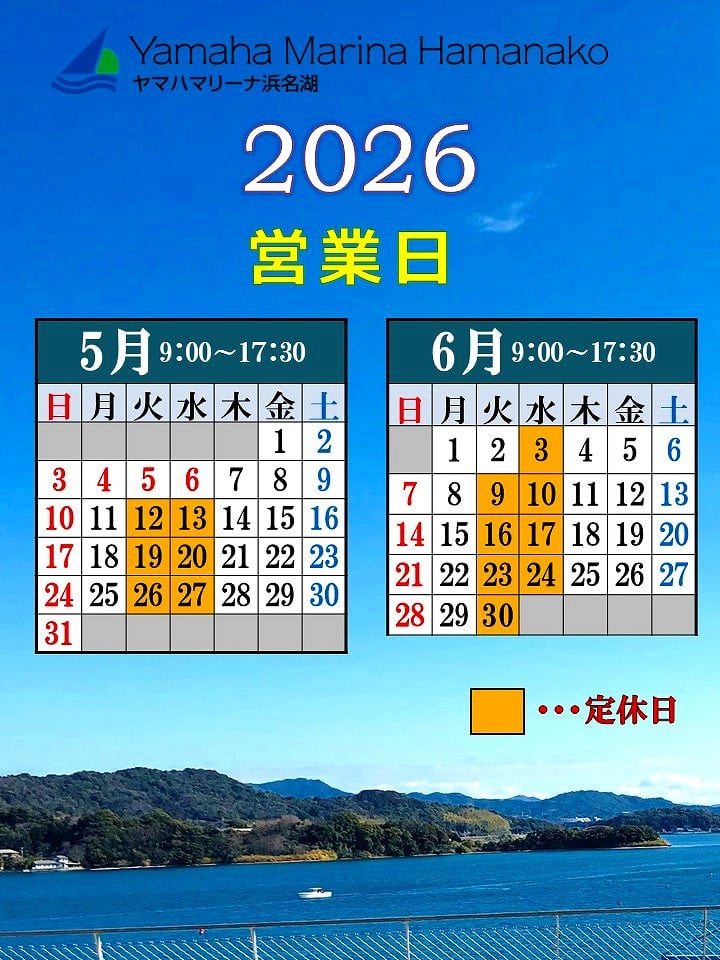 2026年5月・6月 営業カレンダー 2026年04月04日(土) InformationSHOP情報スタッフレポート営業案内 ヤマハマリーナ浜名湖 2026年5月・6月の営業カレンダーです。 ヤマハマリーナ浜名湖 ℡ 053-578-1114